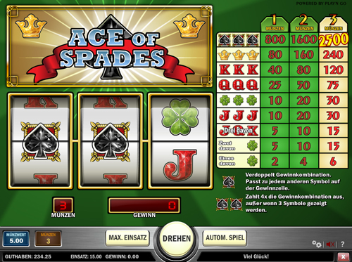 Du kannst deine Gewinne sogar exponentiell steigern, denn während normalerweise bei den Kleeblättern, den Kartensymbolen oder den Kronen die Gewinne bei dreifachem Einsatz auch drei Mal erhöht werden ist das bei dem Ace of Spades anders. Denn hier kannst du bei einem Einsatz von drei Münzen mehr als dreimal so viel Gewinnen. Damit sollte deine Entscheidung natürlich auch immer lauten, dass du lieber mit kleinerem Einsatz und dafür mit drei Münzen spielst.