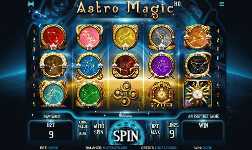 Der Spieltitel lässt bereits vermuten, dass ein wenig Magie auf dich zukommen wird. Das erkennst du unter anderem an der Kristallkugel, die zwischen diversen anderen Symbolen auf den Walzen auftritt. Apropos: Astro Magic bietet ein Grundgerüst aus fünf Walzen und neun Gewinnlinien – ein bekanntes Konzept, das den Einstieg in die Welt der Wahrsagerei erleichtert. Kombinationen lassen sich wie üblich von links nach rechts bilden. Um einen Gewinn zu erzielen, musst du mindestens drei übereinstimmende Symbole aufdecken. Hast du den Einsatz erst einmal gewählt, lassen sich die Walzen in Gang setzen und offenbaren dir sicher bald deine persönlichen Glückssymbole, die zu verschieden hohen Auszahlungen führen.