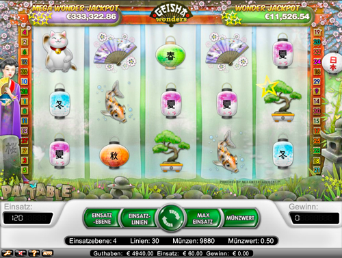 Geisha Wonders ist ein online Slot mit fünf Walzen, insgesamt 30 Gewinnreihen, einem mystischen Asia-Setting und integrierten Jackpots. Klingt für den Anfang nicht schlecht, oder? Selbst die sonst so langweiligen Kartensymbole wurden ganz entfernt. Dafür gibt es hier bunte Lampions, die besser zur Grundstimmung passen. Darüber hinaus finden sich Fächer, Teekessel, Bonsai Bäume, Koi Karpfen und winkende Katzen auf den Rollen. Typisch asiatisch eben!